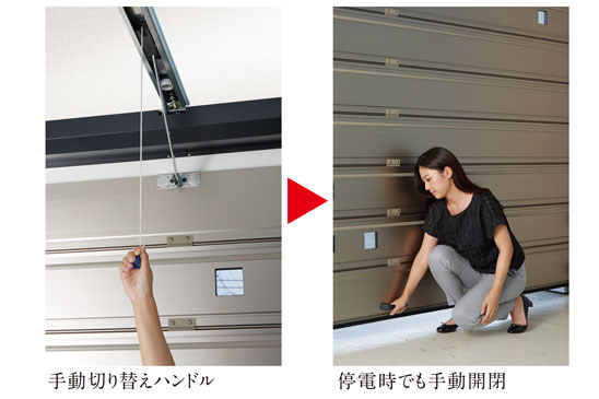 手動切り替え用の紐を引くだけでワンタッチで手動開閉に切替え。停電時に手動で開閉することができます。